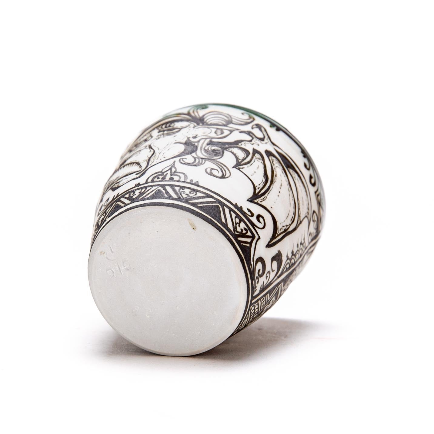 Stoneware with wax resist drawings and oxides. ^10 Reduction
