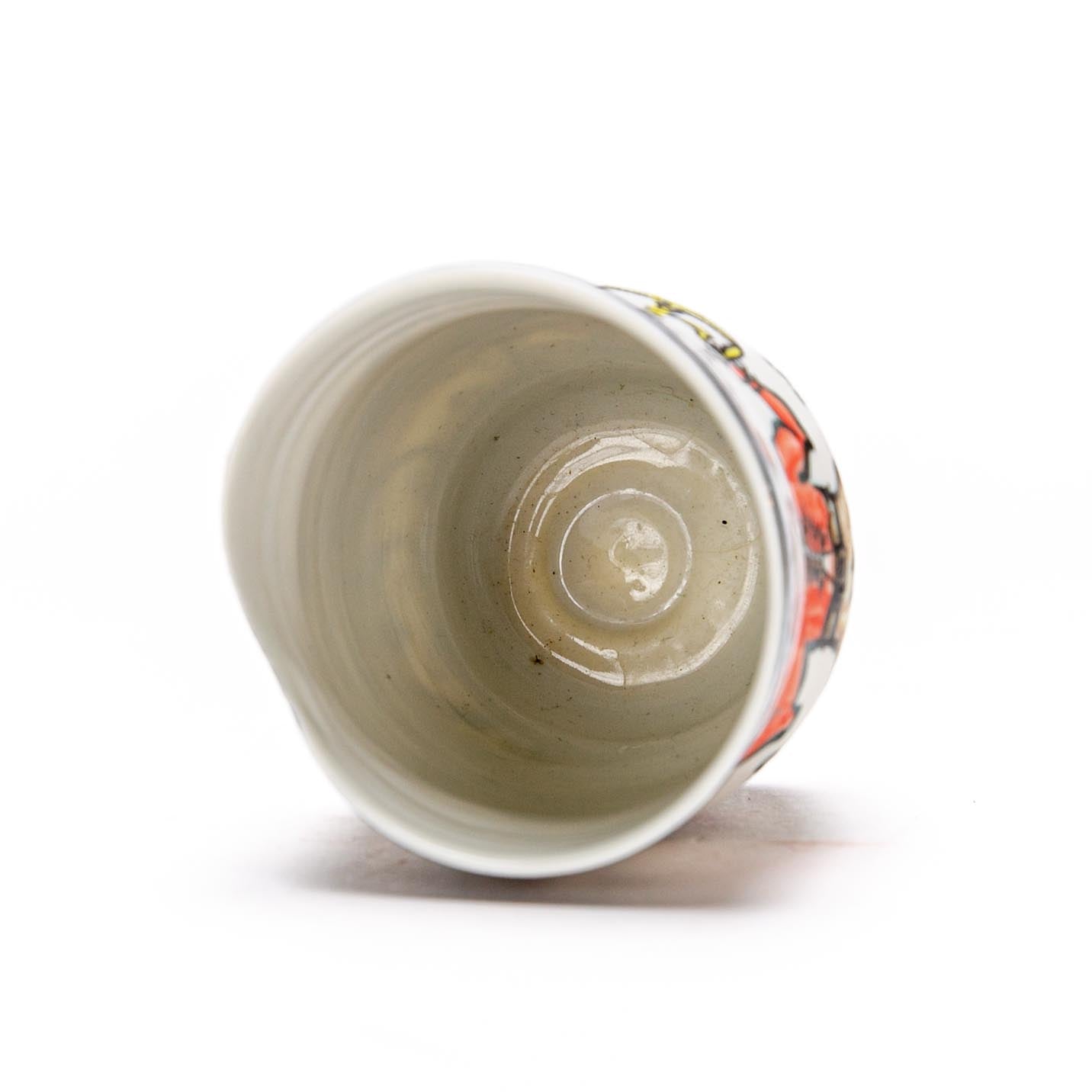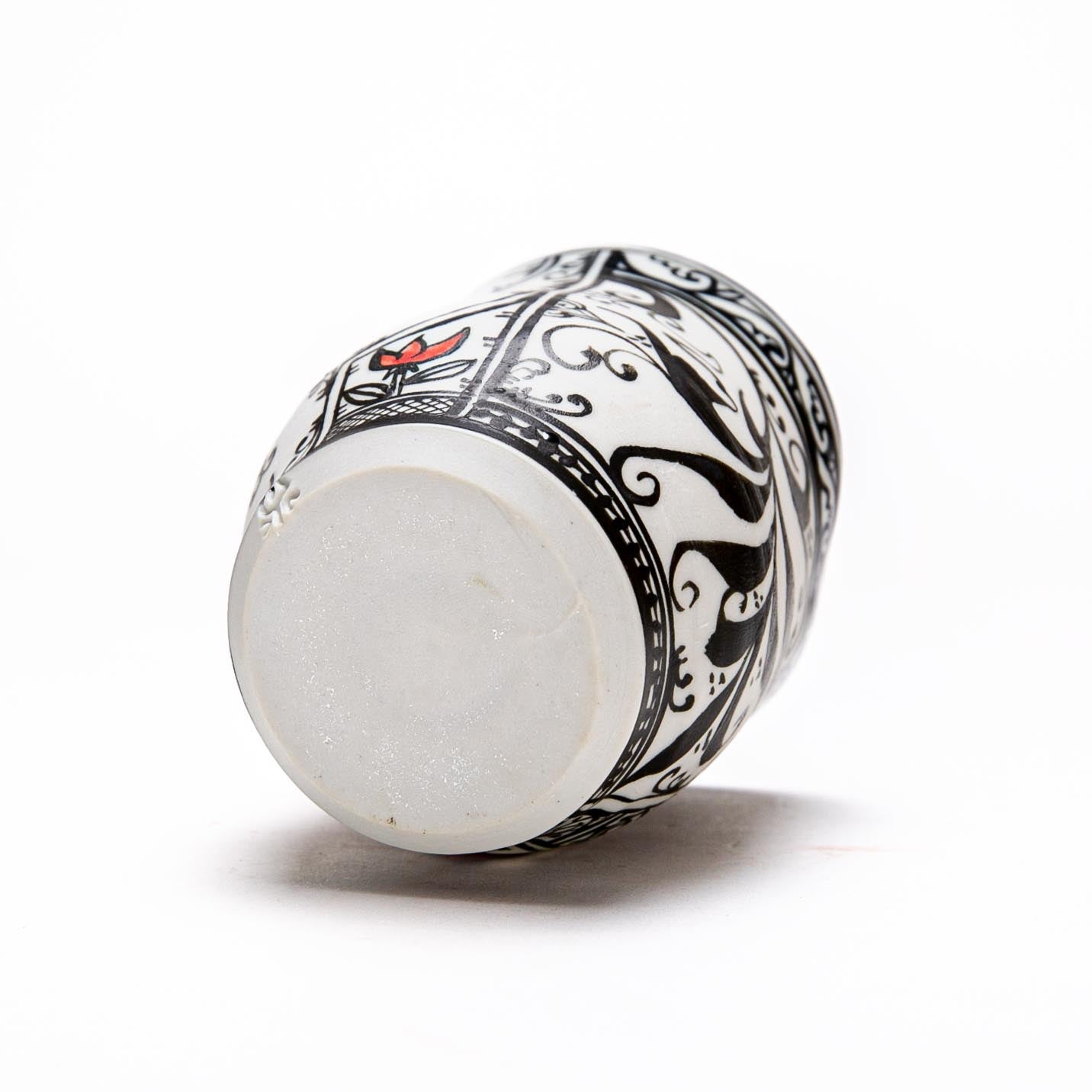 Stoneware with wax resist drawings and oxides. ^10 Reduction