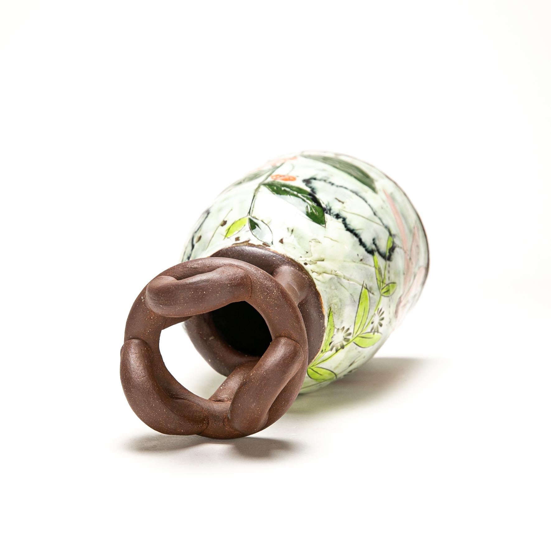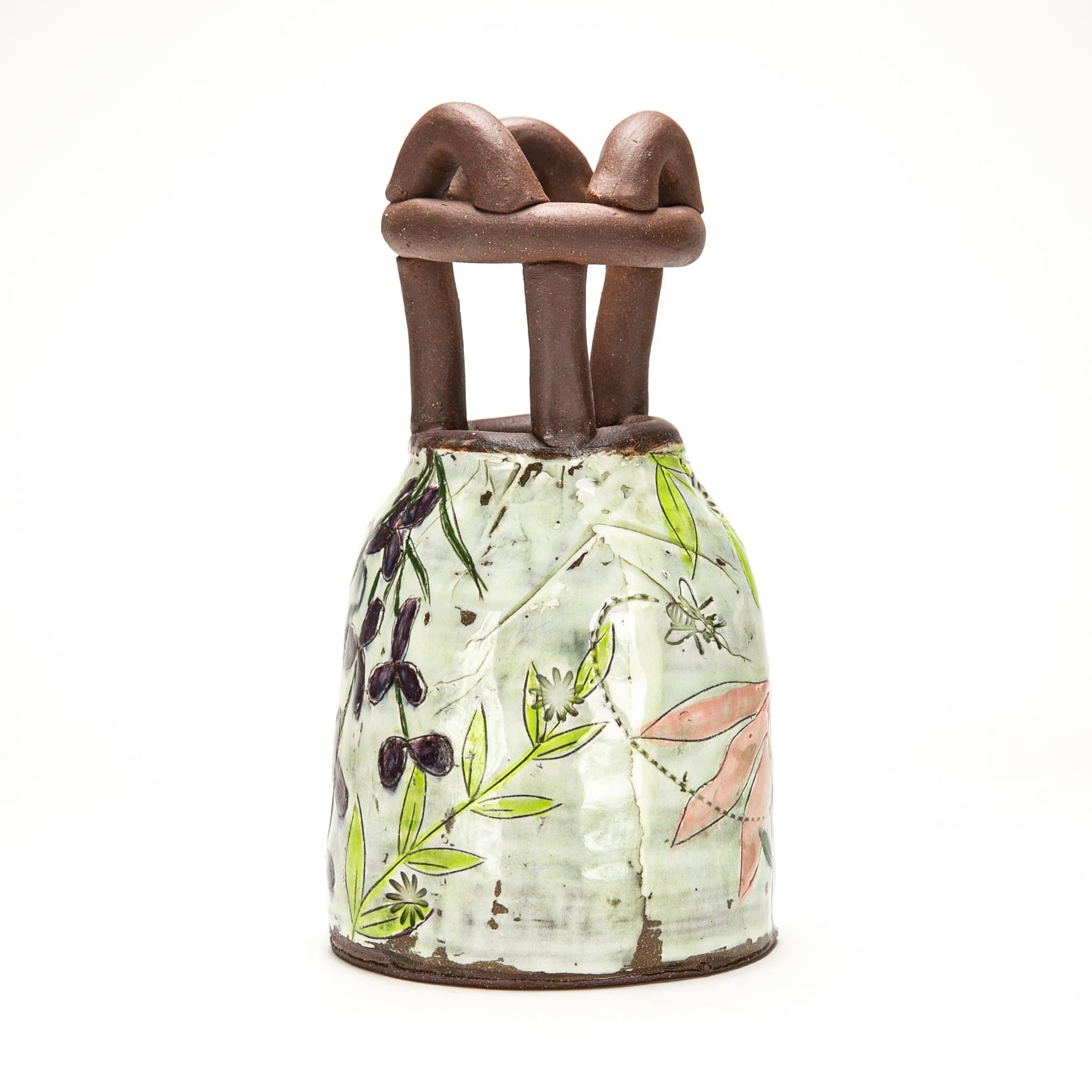 Red stoneware with slip and underglaze. Hand built. ^5 Oxidation
