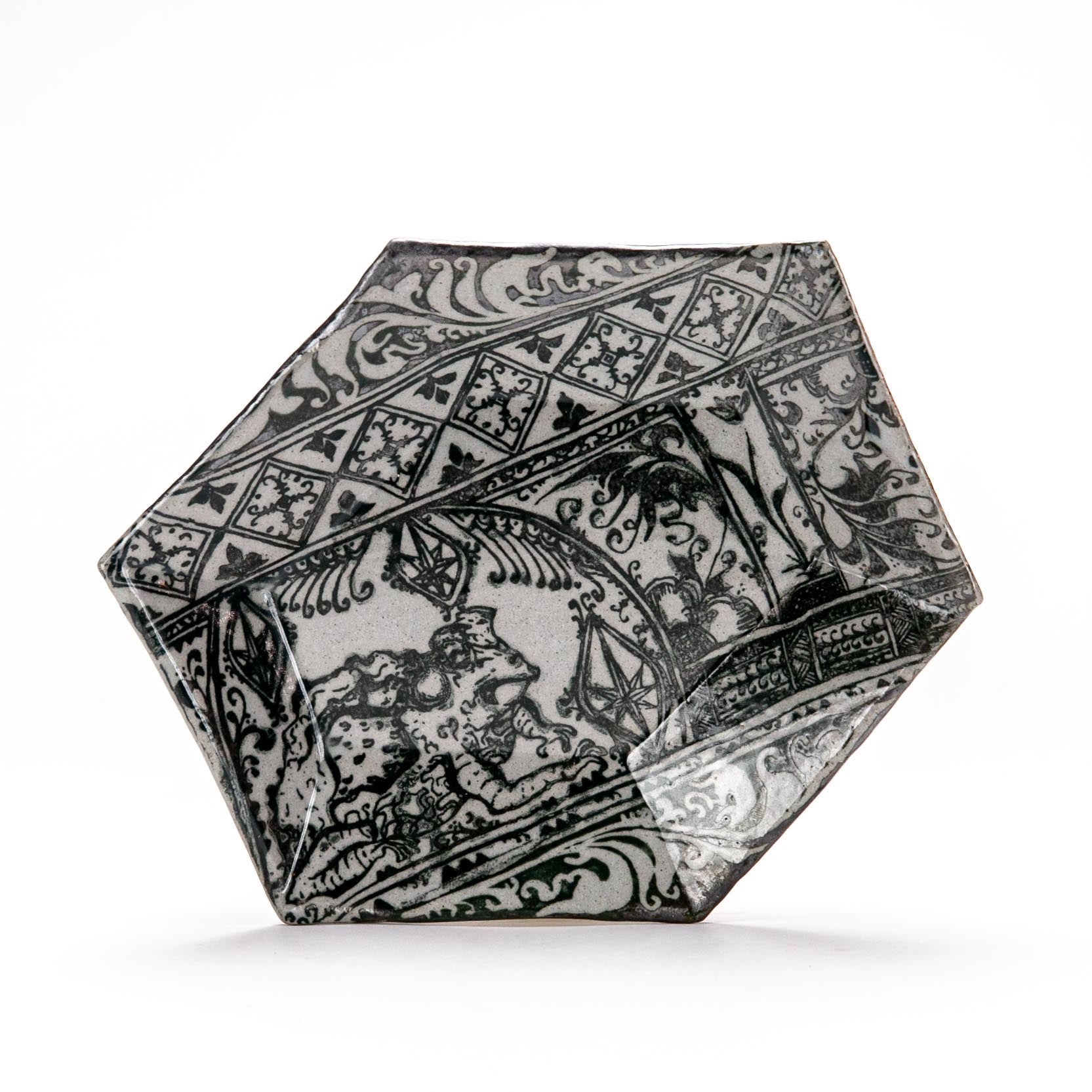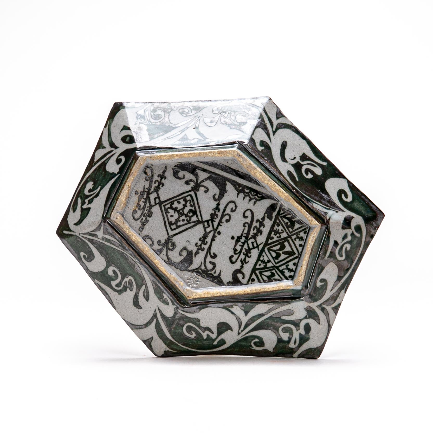 Stoneware with wax resist drawings and oxides. ^10 Reduction
