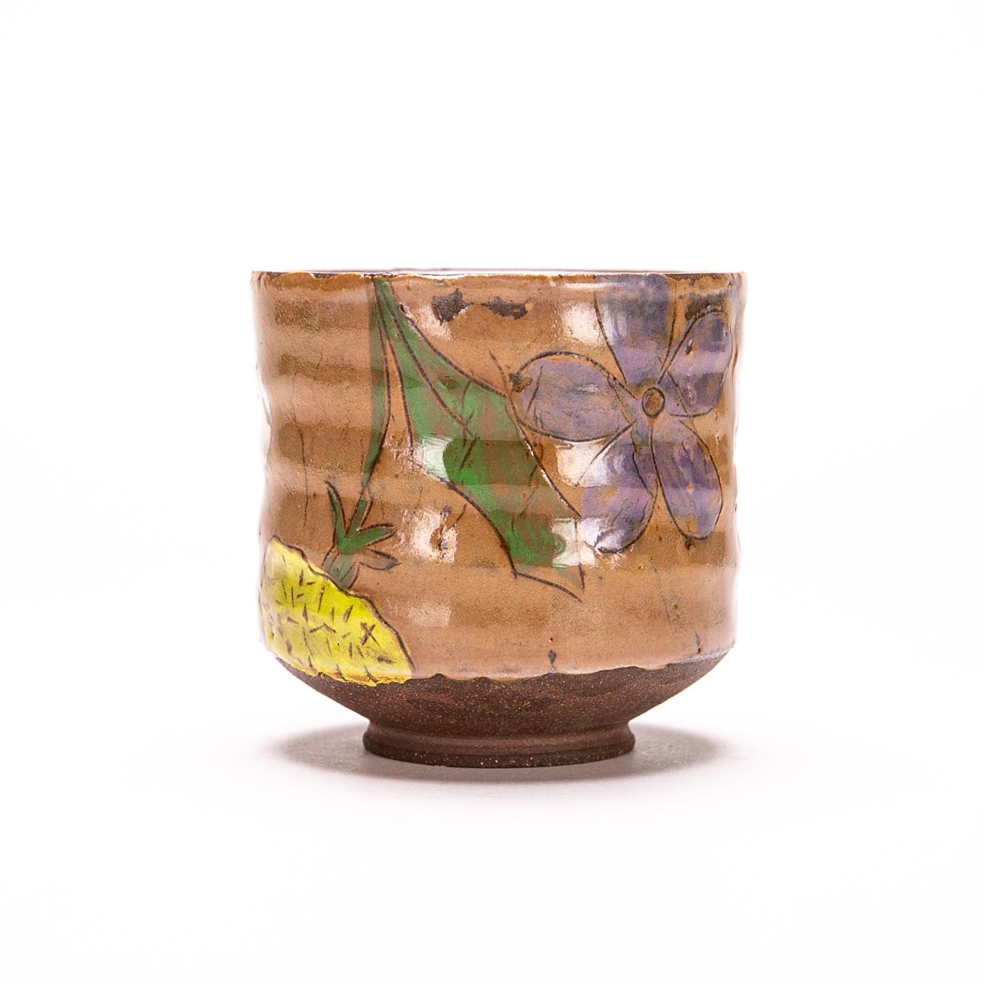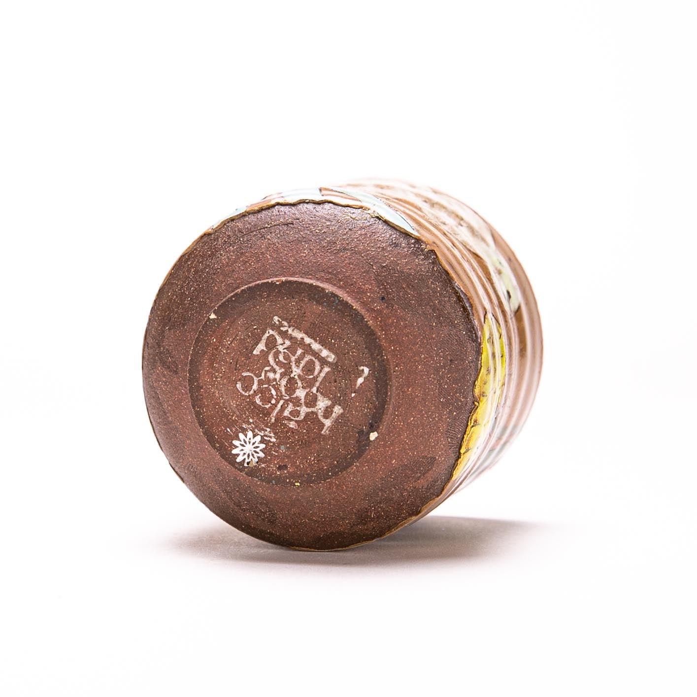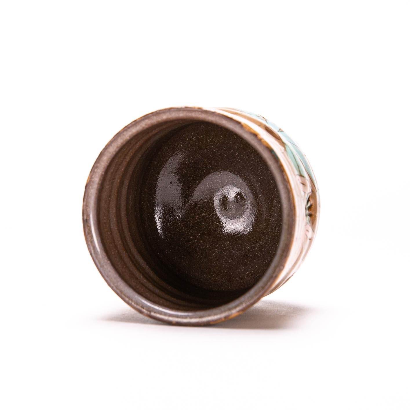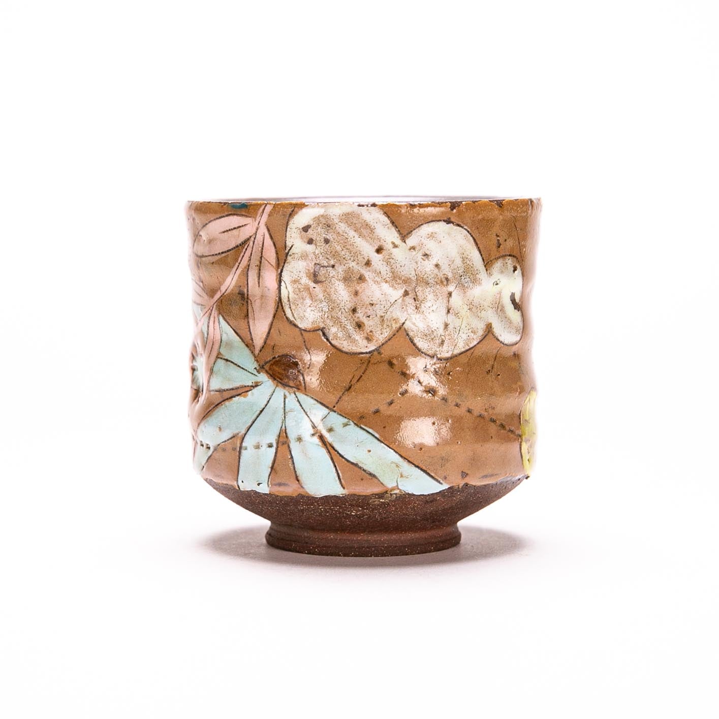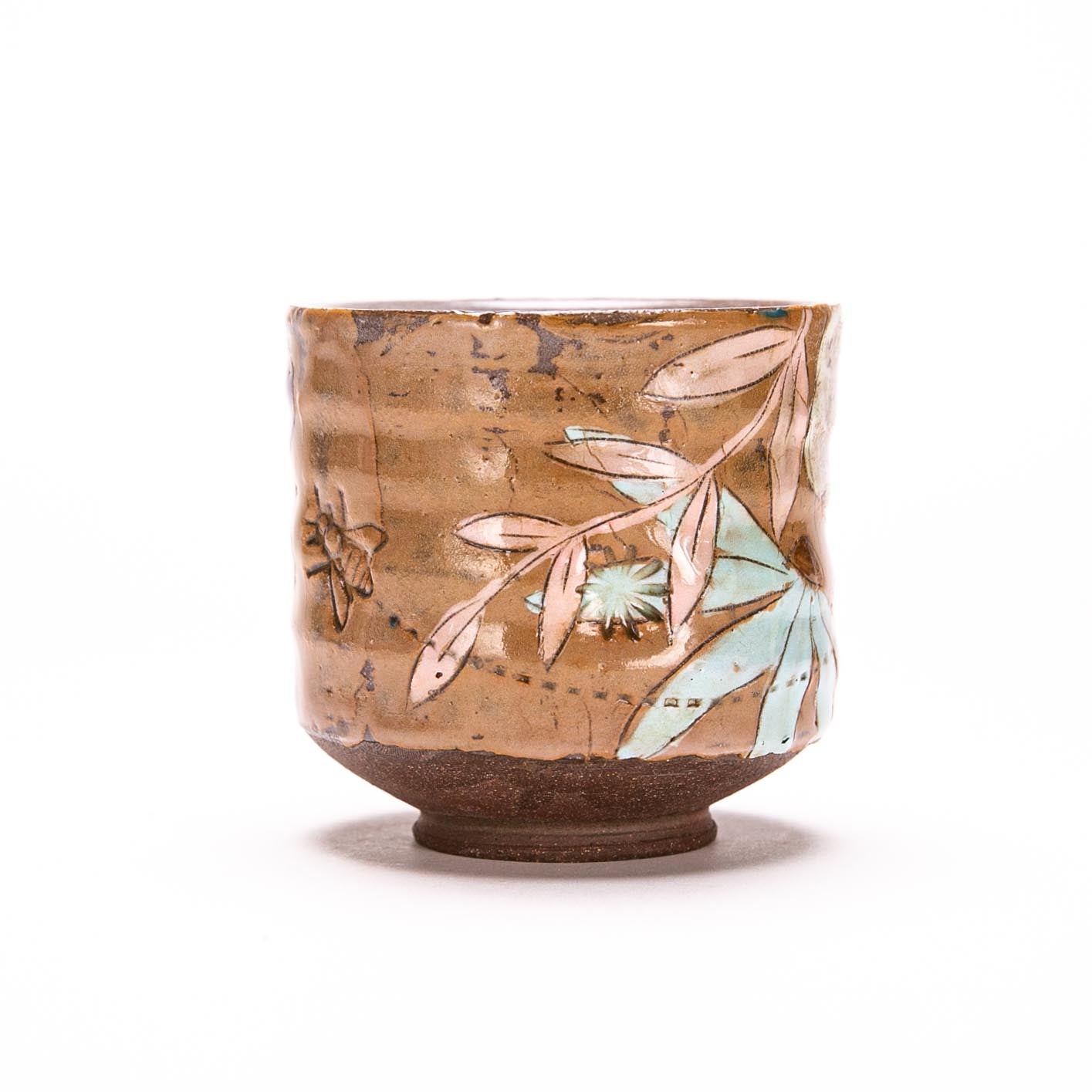 Red stoneware with slip, underglaze, and stamps. ^5 Oxidation